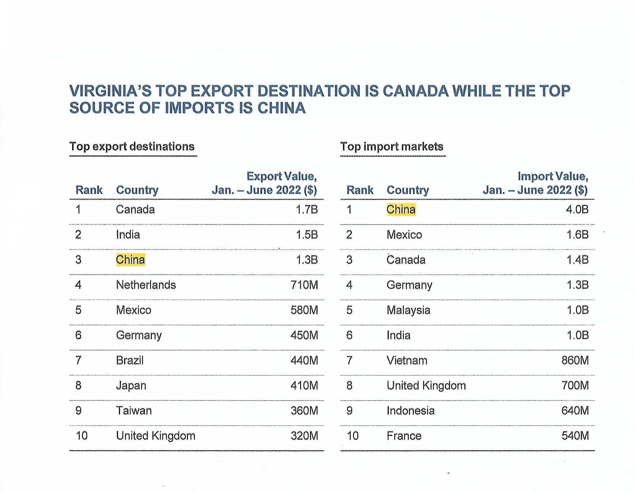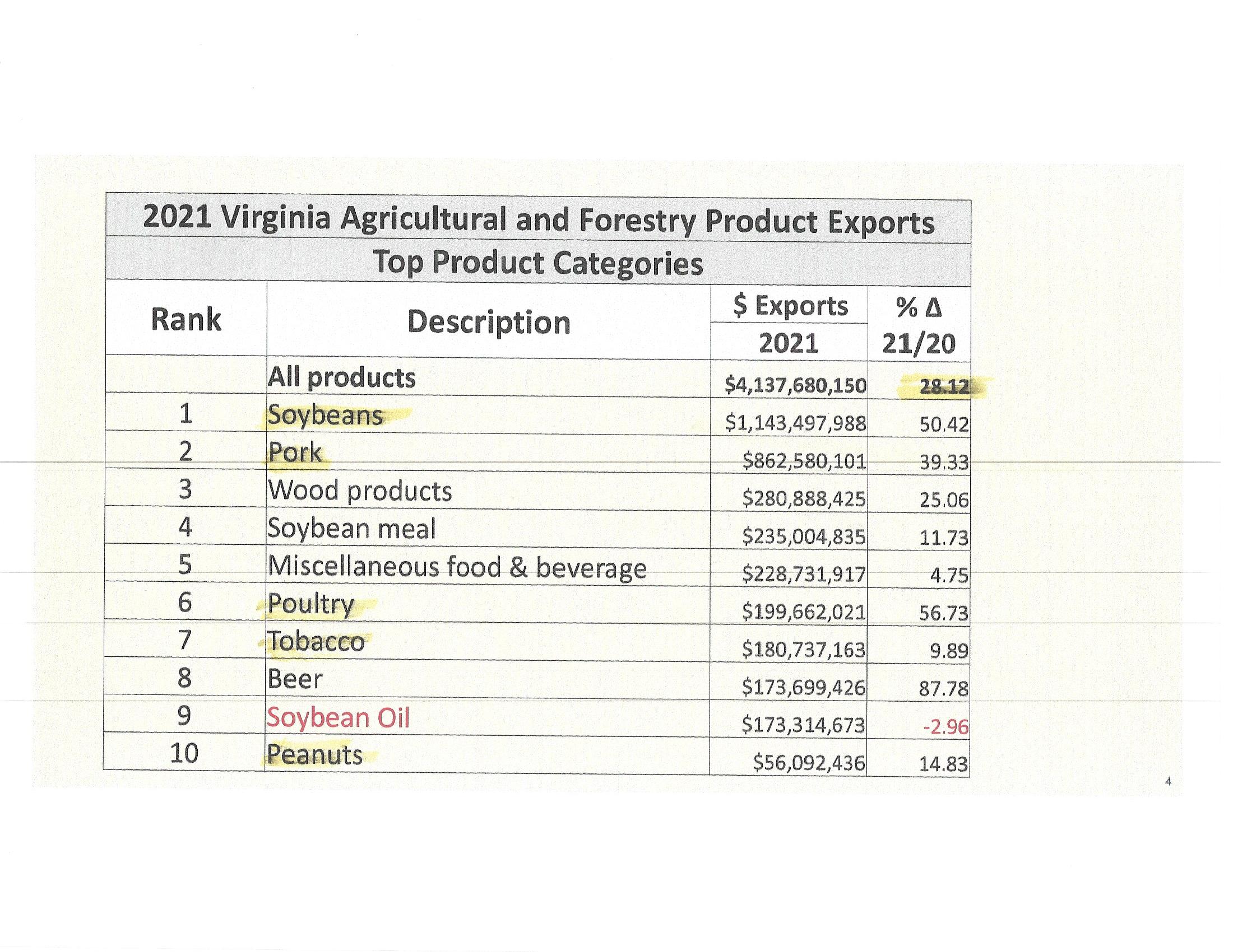 China is Virginia’s third largest export market and is largest importer into Virginia. Virginia’s agricultural exports have increased year-over-year. (Major export commodities — soybean, pork, poultry, peanuts and tobacco.) So, what can be said? You need to be global to have a flourishing state economy. Trade with China is important, but Virginia transactions are broad and throughout the world. (Charts below are from the Virginia Economic Development Partnership and the Virginia Dept. of Agriculture.)